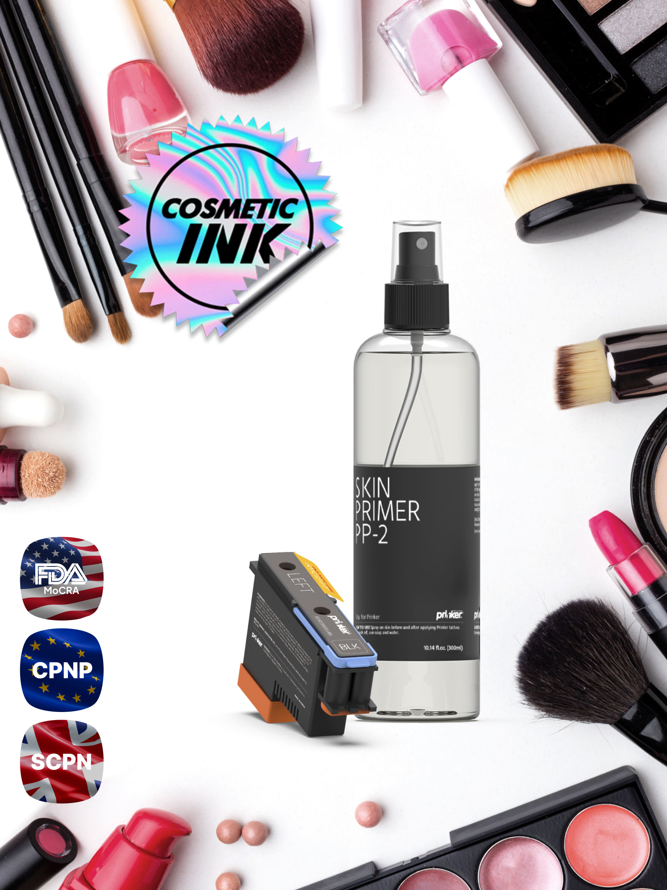 أحبار برينكر إس وبرايمر البشرة مُطوّران خصيصًا باستخدام تركيبة تجميلية، ومُسجّلان لدى إدارة الغذاء والدواء الأمريكية (FDA) ووزارة الصحة (MoCRA)، ومُسجّلان لدى CPNP (الاتحاد الأوروبي) وSCNP (المملكة المتحدة) كمنتجات تجميلية. أحبار برينكر مقاومة للتلطخ والماء، وفي الوقت نفسه، يُمكن إزالتها بسهولة بالماء وقليل من الصابون أو بمزيل المكياج. مع برايمر البشرة، تدوم التصاميم المطبوعة لفترة أطول على بشرتك.