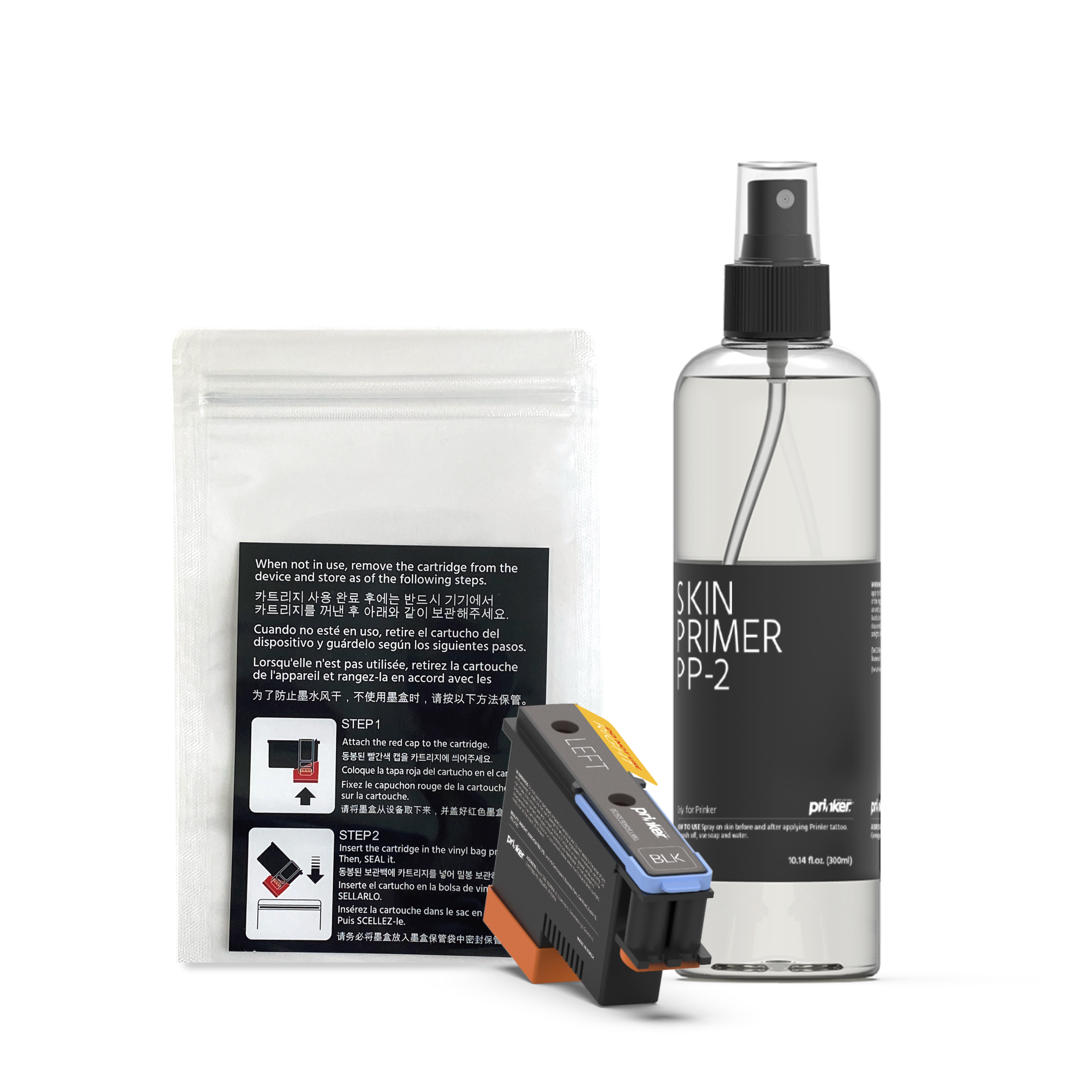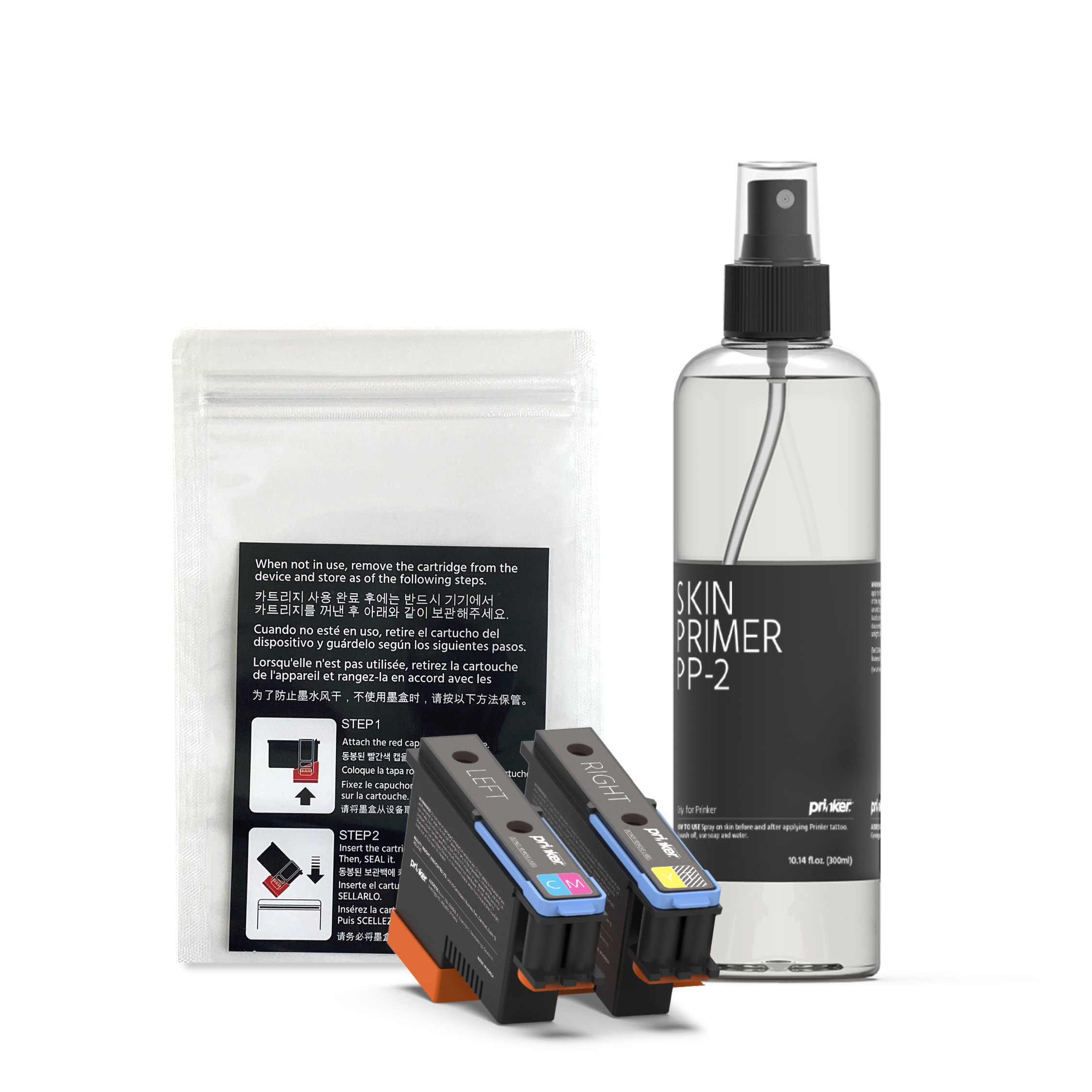 هناك نوعان من مجموعات المواد الاستهلاكية للاختيار من بينهما. إذا كنت تفضل أن تكون وشماتك المؤقتة باللون الأسود الغامق، فاختر خرطوشة الحبر الأسود . أما إذا كنت ترغب في أن تكون تصاميمك بألوان زاهية وأسود مركب، فإن خراطيش الحبر الملون هي الأنسب لك! تكفي كل مجموعة خراطيش لما لا يقل عن 1000 طباعة. يختلف عدد الوشوم التي يمكنك طباعتها حسب حجم وتعقيد التصاميم.